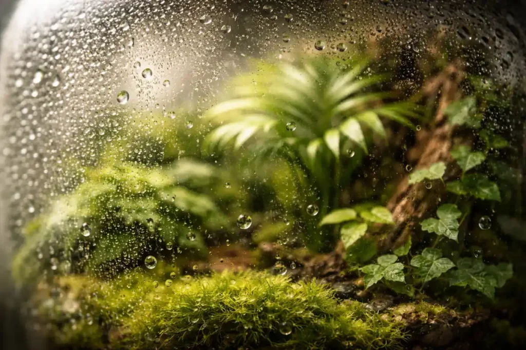 Тепер про запотівання, бо це найчастіший запит. Чому запотіває флораріум? Бо так працює цикл води. Легка димка або дрібні краплі на склі, особливо вранці, це нормально. Протягом дня вони можуть зникати або слабшати, і це якраз хороший знак.